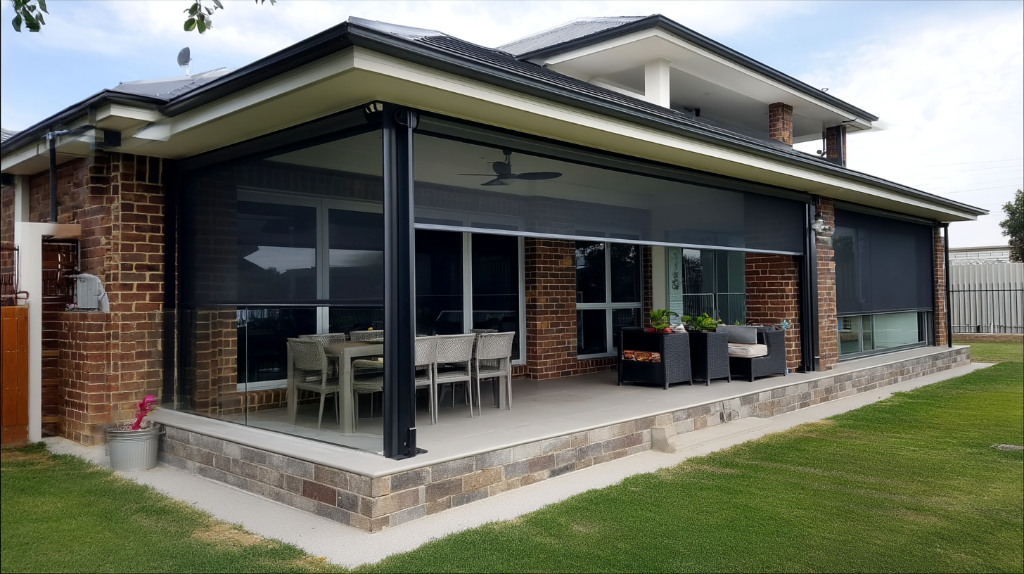 Premium top zip screen system offering superior sun protection and wind resistance for large windows and openings.